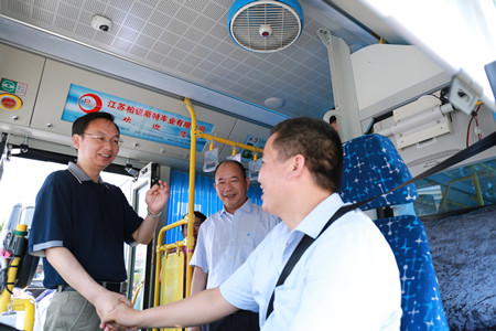 隨后,敖考權(quán)一行來到公交樞紐站,走進(jìn)公交車廂,向堅(jiān)守在一線的公交駕駛員表示親切慰問,并為駕駛員們送上消暑慰問品。敖考權(quán)緊緊握住公交駕駛員的手,關(guān)切地詢問他們的身體情況和營運(yùn)排班情況,感謝他們?yōu)楸U鲜忻癯鲂兴龅呢暙I(xiàn),并囑咐大家注意身體,合理安排作息時(shí)間,勞逸結(jié)合,確保行車安全,提高公交服務(wù)質(zhì)量。