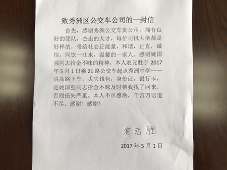 5月3日,乘客農(nóng)先生親自趕到市公交公司秀洲分公司,將一封親筆簽名的感謝信送到值班人員手中,感謝21路姚國強(qiáng)師傅拾金不昧的雷鋒精神。信中這樣寫道:“感謝秀洲公交車貴公司,擁有良好的團(tuán)隊(duì),杰出的人才,每位司機(jī)大佬都是好樣的,帶給社會(huì)正能量,和諧,正職,誠信,同飲一江水,溫馨的一家人?!?/span>